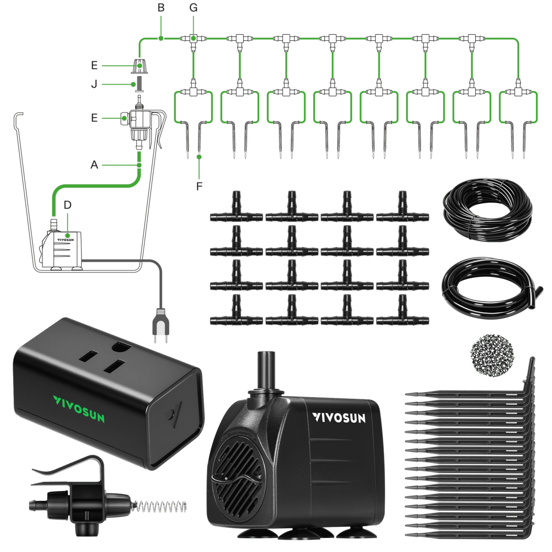 The kit comes with 16 drip emitters, a 15 W pump, Vivosun A10 GrowHub, an anti-siphon connector, 4 mm/8 mm tubing, filter cotton, an anti-kink spring, an equal tee connector, and end caps — everything you need for a reliable watering system. This smart system is designed for plant lovers with busy schedules. Whether you’re running errands, at the office, or away on vacation, your plants stay perfectly watered.